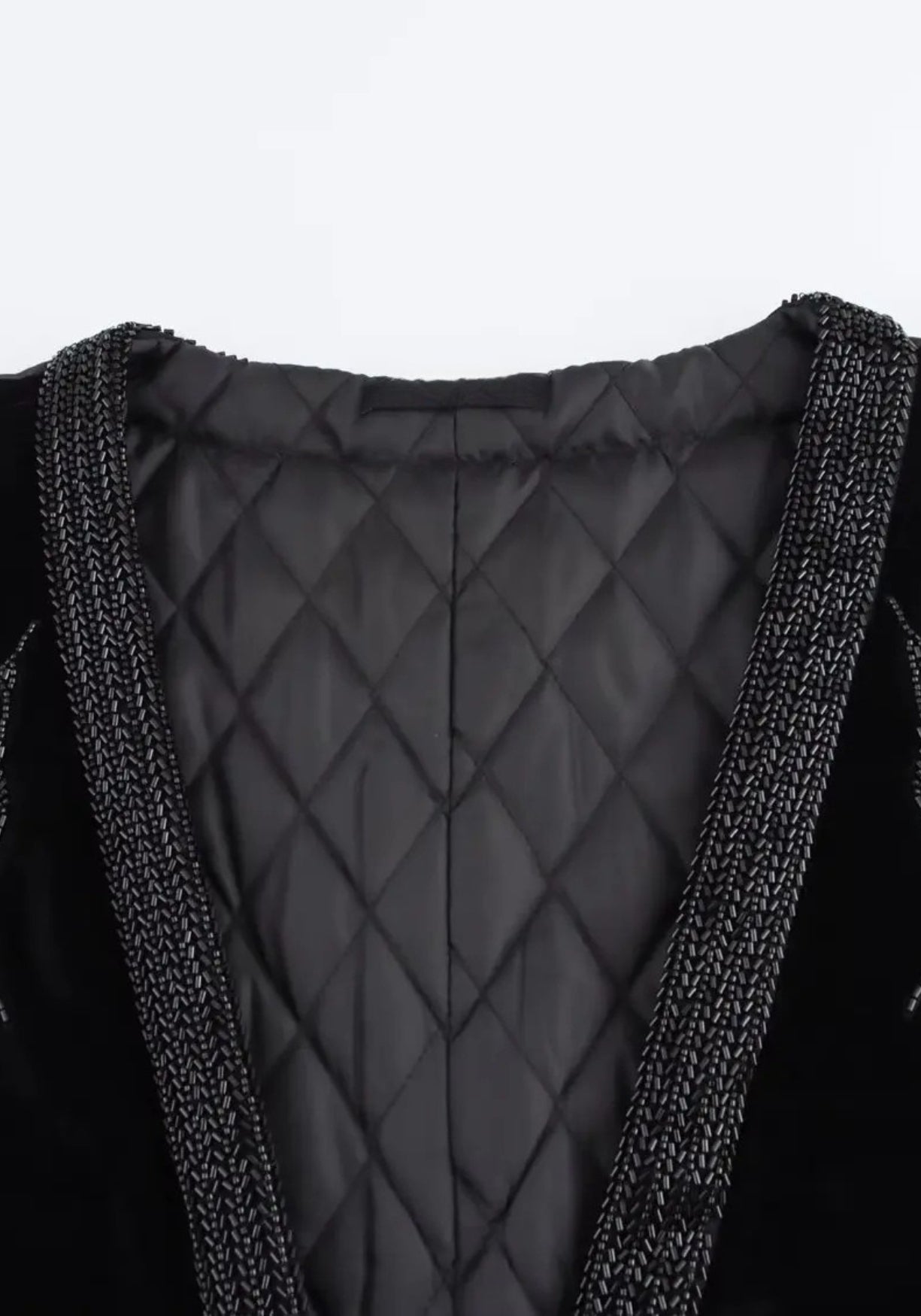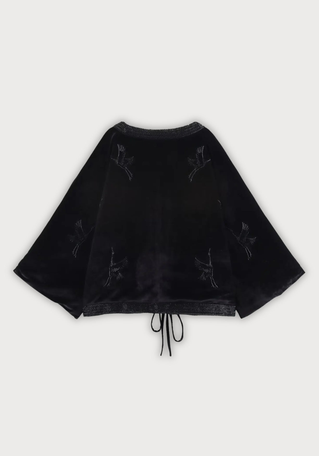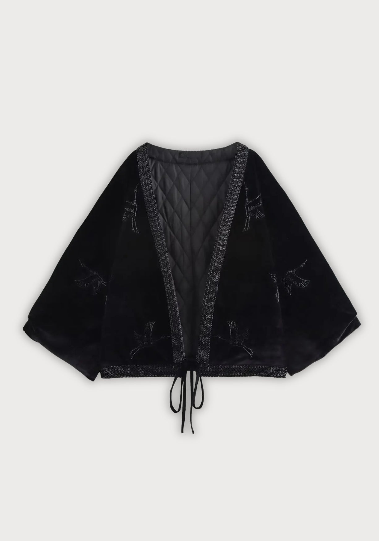 Veste kimono d’hiver noir brodé Plongez dans l’élégance d’un kimono d’hiver revisité avec une touche couture. Ce modèle court , entièrement matelassé , est doublé pour offrir chaleur et confort tout en conservant une allure sophistiquée. Son extérieur en velours noir profond capte la lumière avec subtilité, tandis que la broderie de grues ton sur ton , rehaussée de perles tubulaires noires cousues à la main, apporte du relief et une texture précieuse. La coupe ample à manches larges permet une grande liberté de mouvement et un tombé fluide. La ceinture fine en velours permet de le nouer pour souligner la taille ou de le laisser ouvert pour un look plus décontracté. Chaque détail a été pensé pour conjuguer raffinement et douceur au quotidien. À porter sur un col roulé ou une robe simple, pour ajouter une touche luxueuse et inattendue à vos tenues d’hiver. Une veste kimono pensée pour réchauffer les soirs calmes avec une touche de mystère. Composition : 100% polyester.