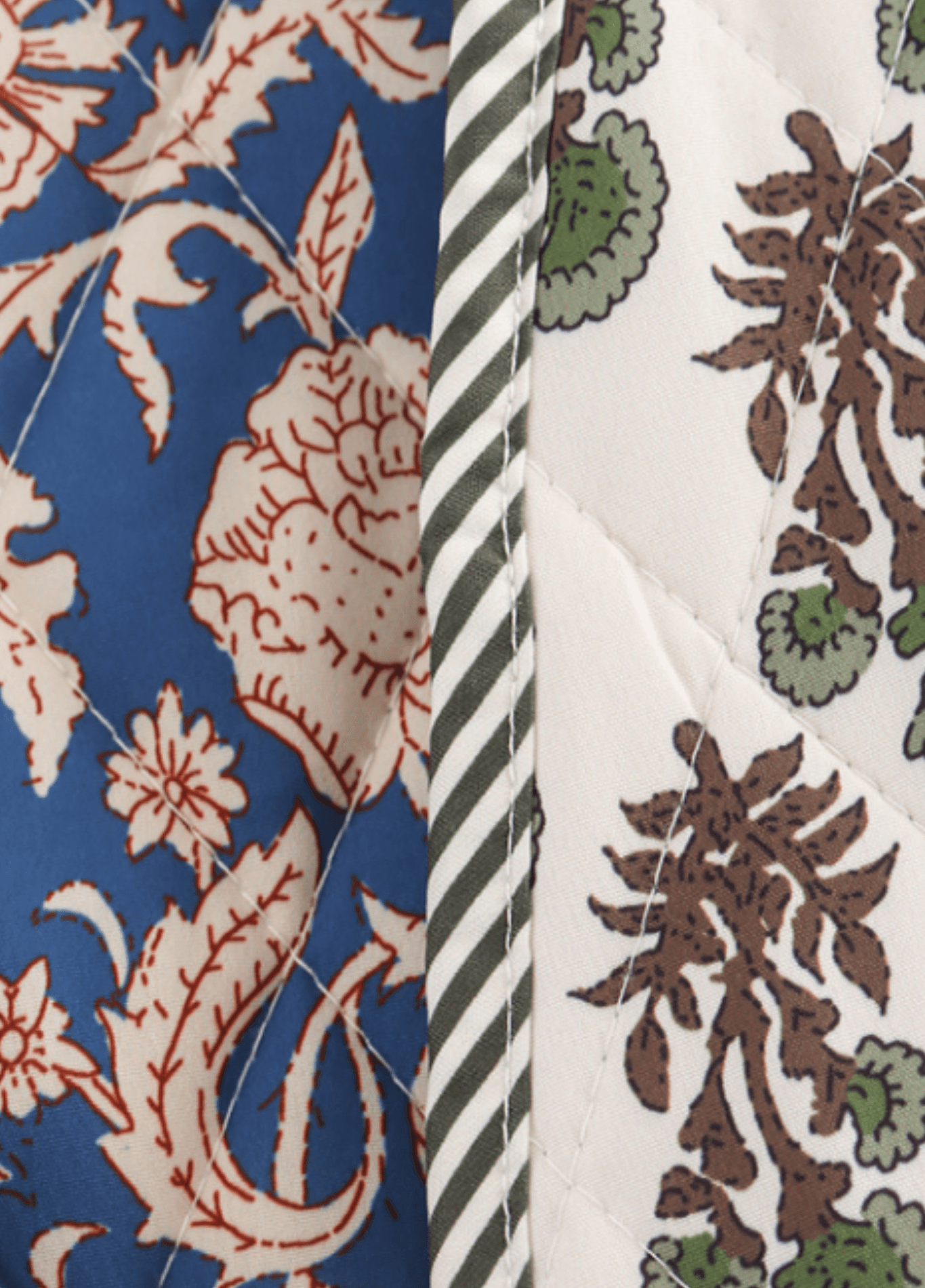 Veste kimono matelassée femme Laissez-vous séduire par notre veste kimono matelassée pour femme, une pièce unique pour votre garde-robe. Ce vêtement allie style contemporain et inspiration japonaise. Cette veste courte présente un style patchwork avec ses lignes épurées mélangeant une inspiration indienne en blanc orné de motifs botaniques bruns et verts, des manches en bleu royal parsemées de roses délicates couleur crème, et une bordure inférieure aux motifs géométriques dans des tons terracotta et prune. Ce vêtement est confectionné en utilisant du twill (ou sergé) pour les bordures rayées. Cette technique de tissage traditionnelle, où s’entrecroisent les fils de chaîne, apporte une élégance aux finitions. Cette veste kimono avec sa fermeture ouverte, ses manches longues, sa coupe droit