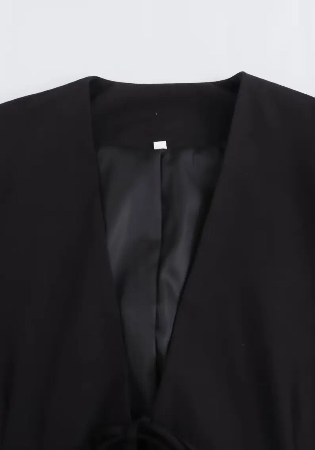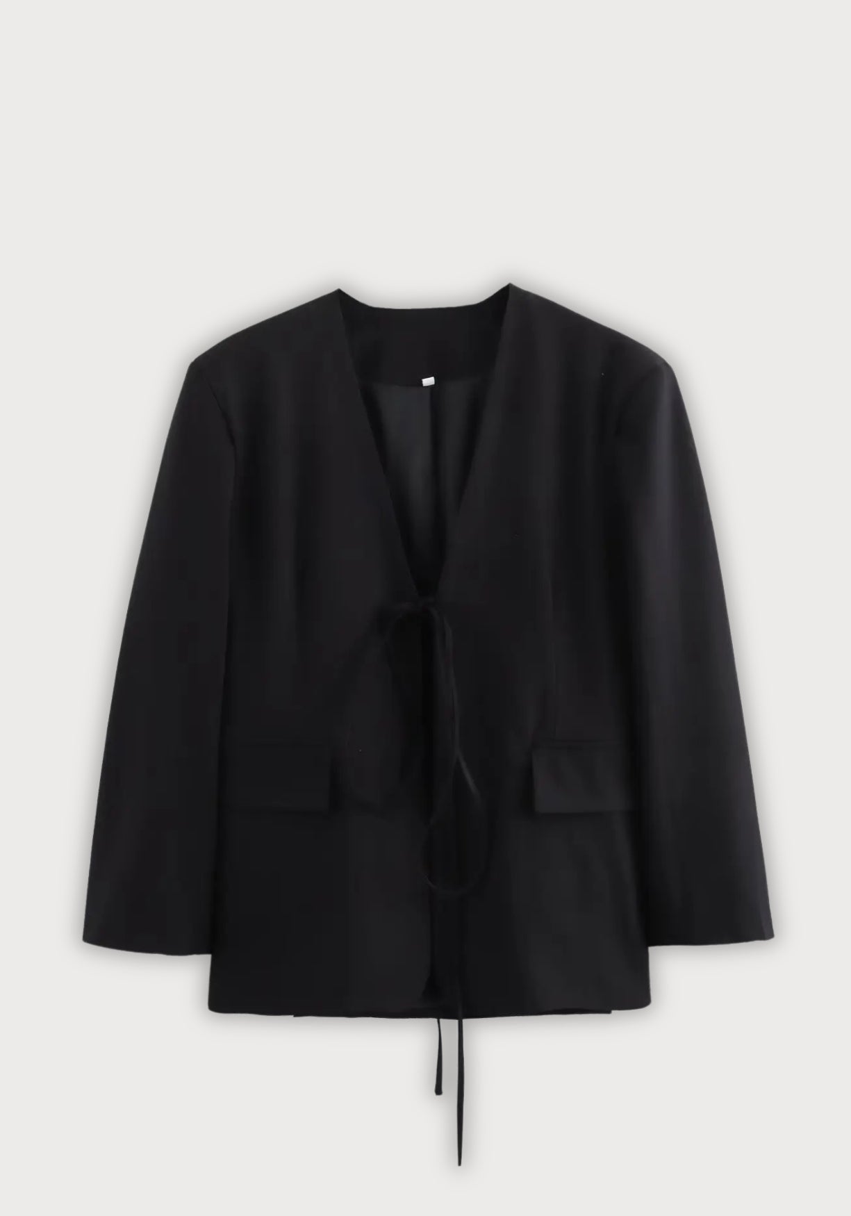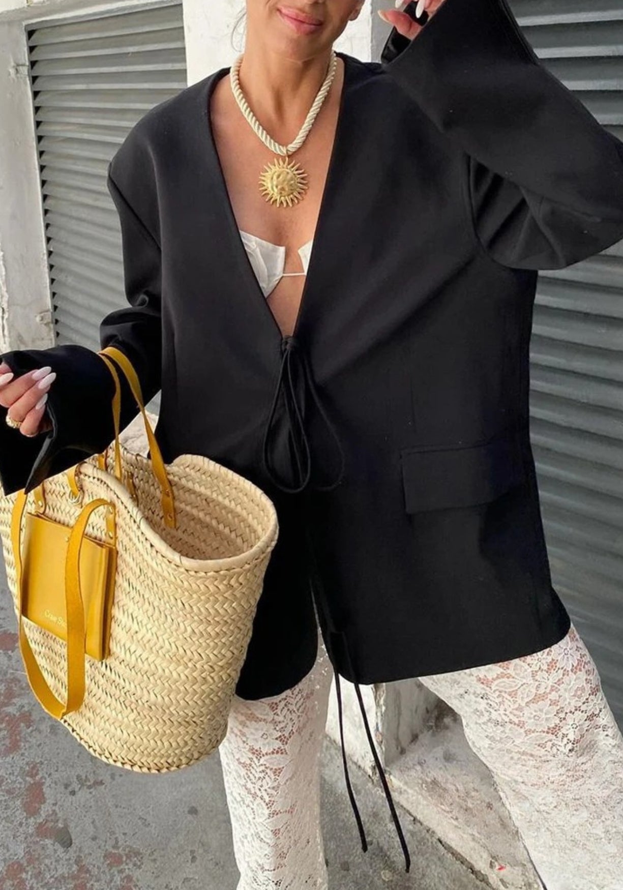 Veste kimono noire oversize pour femme Épure et caractère. Cette veste kimono noire revisite les lignes traditionnelles avec une modernité assumée. Confectionnée dans une matière lisse à la tenue élégante, elle présente une coupe droite oversize , équilibrée par une ceinture discrète à nouer sur le devant . Le col en V profond , sans revers, lui donne une allure minimaliste et raffinée. Les manches longues et amples renforcent le tombé fluide, tandis que les deux poches plaquées soulignent son aspect fonctionnel sans nuire à la sobriété de l’ensemble. Parfaite pour superposer sur une tenue d’été ou structurer un look urbain avec caractère, elle se porte aussi bien ouverte que ceinturée. L’équilibre parfait entre ligne contemporaine et héritage kimono. Composition : Coton Polyester