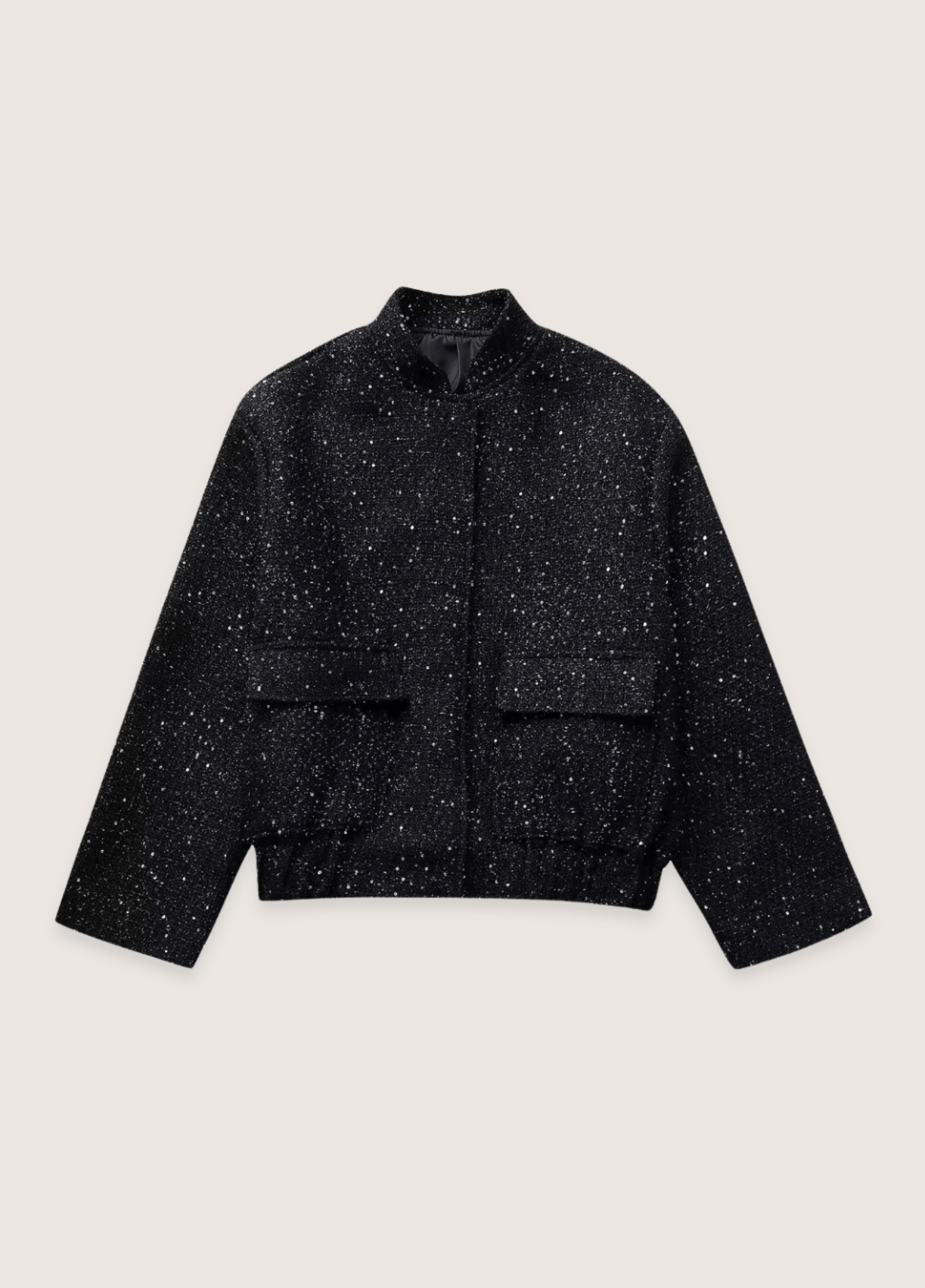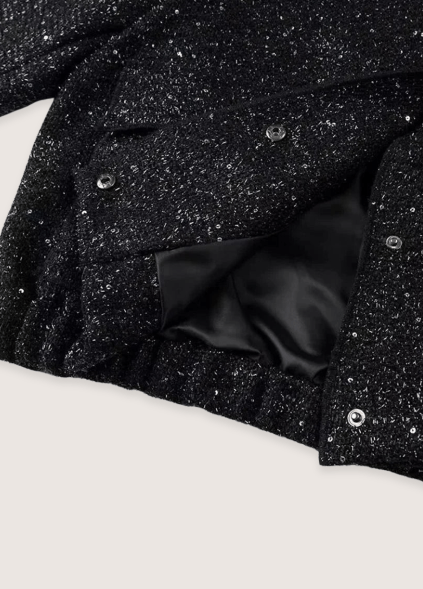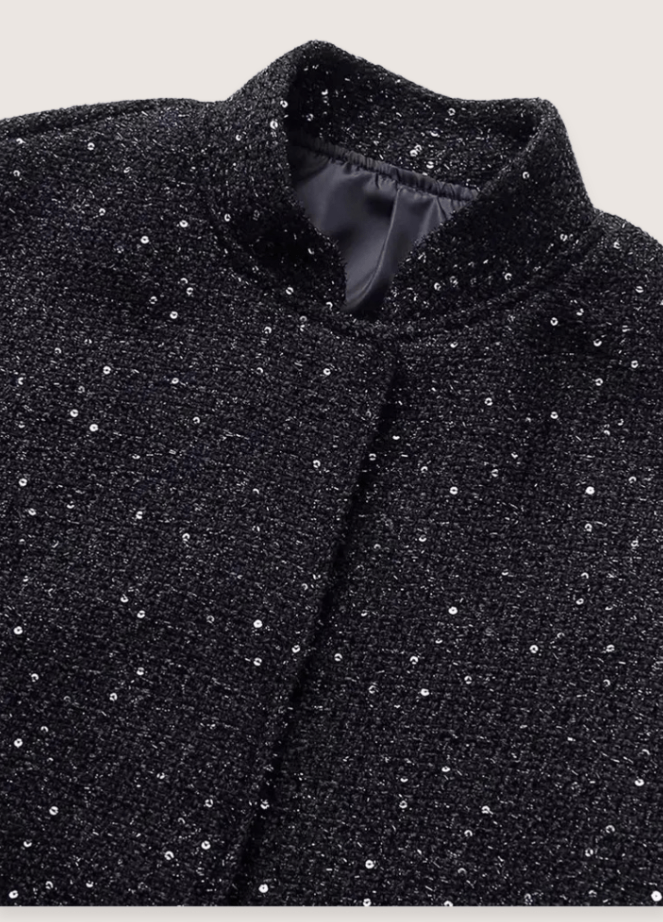 Veste kimono noir à paillettes pour femme Découvrez notre veste kimono noir à paillettes , une pièce unique alliant élégance et tradition japonaise dans un style moderne et urbain. Ce vêtement est idéal pour toutes les occasions. Un ajout précieux à votre collection. Cette veste kimono présente un tweed texturé noir parsemé de paillettes et sequins scintillants qui créent un effet lumineux subtil. Le tissu noir mêle fil bouclé, sequins et fil métallisé dans une trame complexe et travaillée. De petites fleurs formées par des sequins scintillants ornent délicatement l’ensemble de la pièce. La doublure en satin noir apporte un effet raffiné et discret. La veste kimono avec ses manches amples droites style kimono 7/8 crée une silhouette moderne et épurée. Le col mandarin sobre et minimaliste a