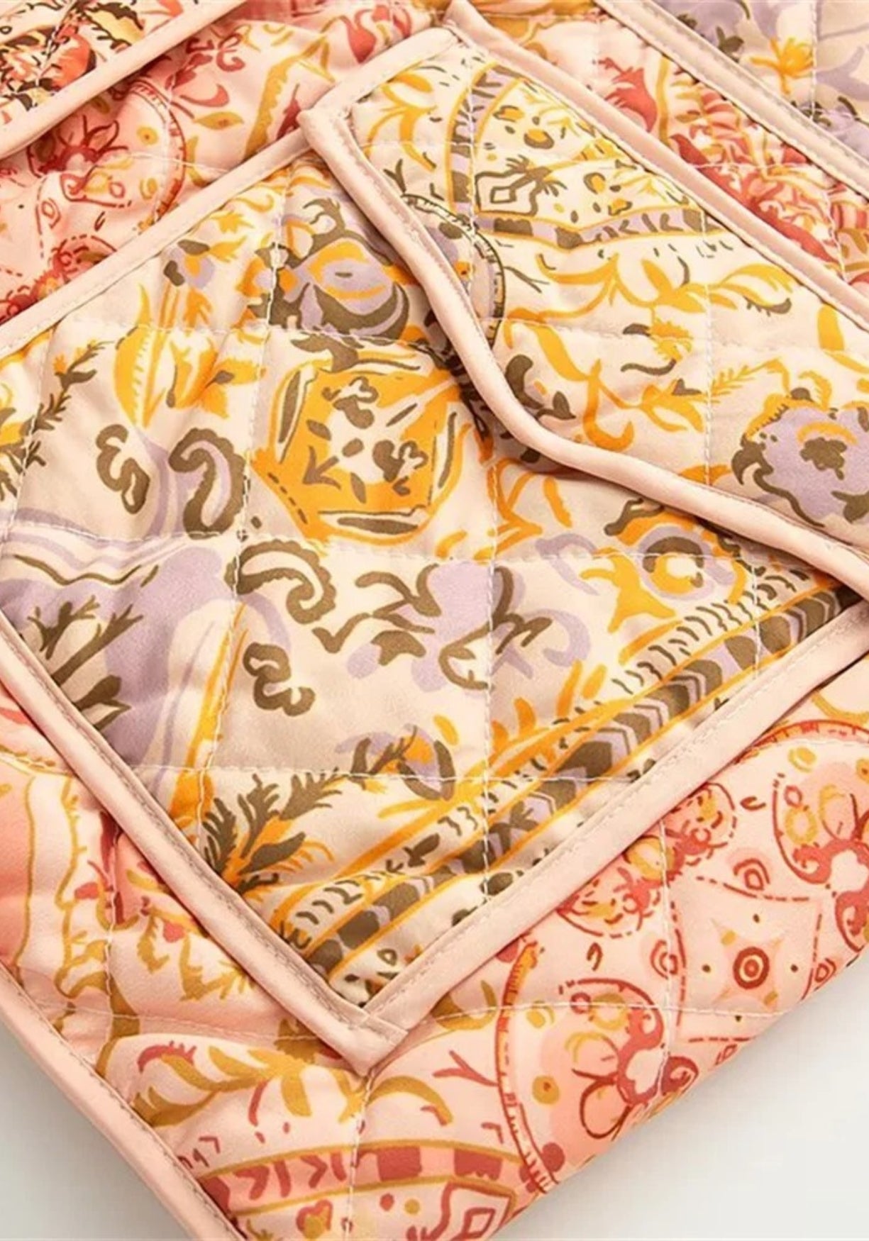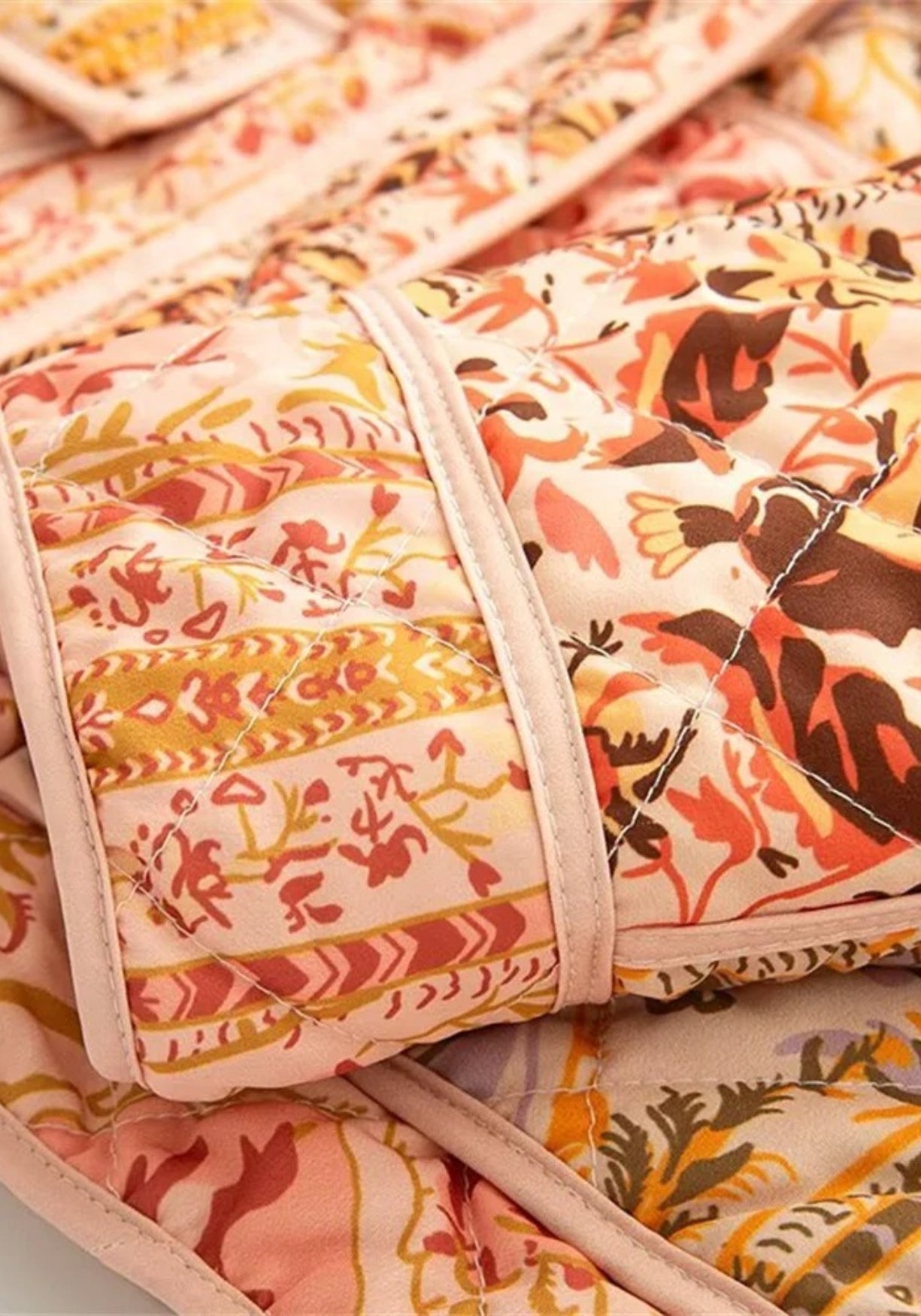 Veste kimono matelassée aux imprimés patchwork pastel Cette veste kimono matelassée pour femme séduit par ses motifs patchwork riches et lumineux. Inspirée d’un mélange bohème et raffiné, elle marie des teintes chaudes : pêche rosée, jaune safran, or