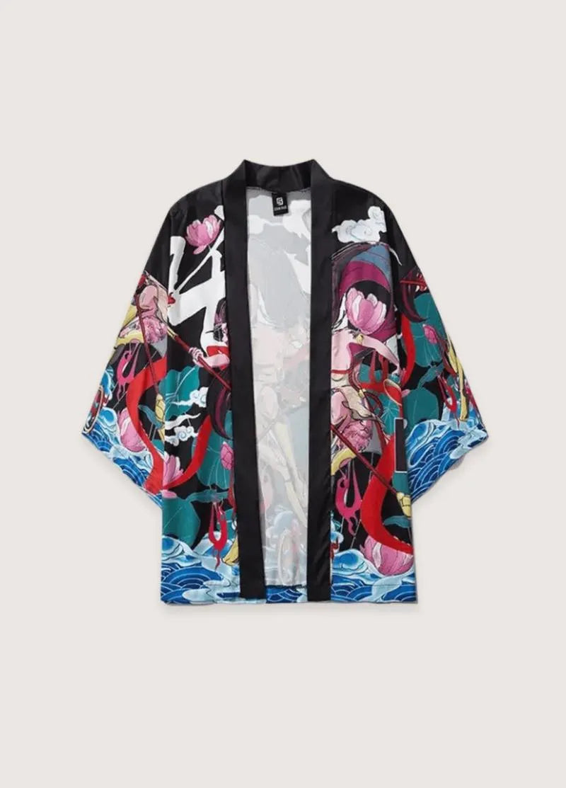 Vêtement japonais traditionnel pour homme au style authentique Ce vêtement traditionnel japonais homme incarne l’essence même de l’élégance nippone avec ses motifs artistiques vibrants où se mêlent harmonieusement bleus profonds et rouges éclatants.
